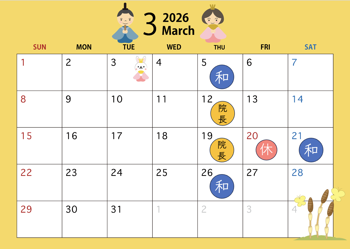 3月の診療カレンダーです。5日と21日と26日が和友医師の診療となります。20日は祝日です。よろしくお願いします。